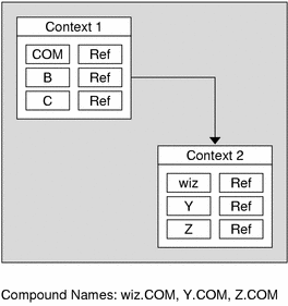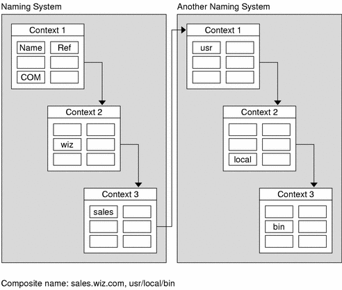 Figure 1-7 shows an example of a federated naming system with composite names. The position of the name within a context has no inherent significance in this illustration.