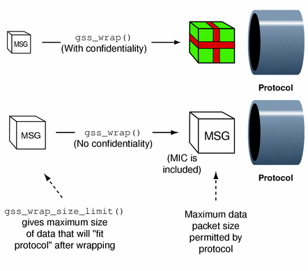 Wrapping a message with gss_wrap() increases its size. Because the protected message packet must not be too big to "fit through" a given transportation protocol, the GSS-API provides a function, gss_wrap_size_limit(), that calculates the maximum size of a message that can be wrapped without becoming too large. The application can break up messages that exceed this size before calling gss_wrap(). It's a good idea to check the wrap-size limit before actually wrapping the message.