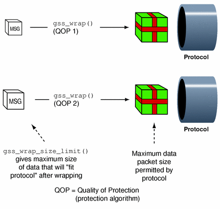 • Which QOP (Quality of Protection) algorithm is used for making the transformation. Since the default QOP can vary from one implementation of the GSS-API to another, a wrapped message can vary in size even if you do not specify a non-default QOP. This is shown in the following figure.
