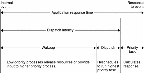 Figure 9-3 illustrates the internal dispatch latency/application response time of a system, defined in terms of the amount of time a system takes to respond to an internal event. The dispatch latency of an internal event represents the amount of time required for one process to wake up another higher priority process, and for the system to dispatch the higher priority process.