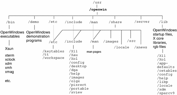 Table 1-2 briefly describes the contents of the top level directories in the OpenWindows directory structure.