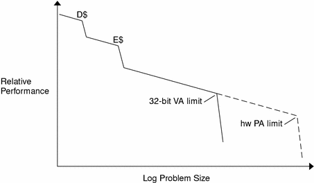 The diagram in Figure 1-1 shows a typical performance versus problem size curve for an application running on a machine with a large amount of physical memory installed. For very small problem sizes, the entire program can fit in the data cache (D$) or the external cache (E$) -- but eventually, the data area of the program becomes large enough that the program fills the entire 4 gigabyte virtual address space available to a 32-bit application.