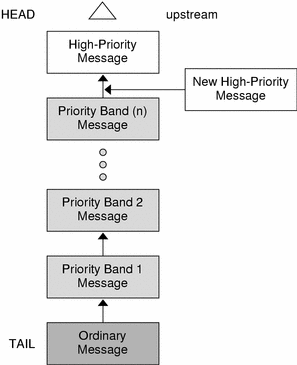 Nonpriority, ordinary messages are placed at the end of the queue following all other messages that can be waiting. Priority messages can be either high priority or priority band messages. High-priority messages are placed at the head of the queue but after any other high-priority messages already in the queue. Priority band messages enable support of urgent, expedited data. Priority band messages are placed in the queue in the following order: