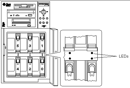 Disk errors may be reported in a number of different ways. Often you can find messages about failing or failed disks in your system console. This information is also logged in the /usr/adm/messages file(s). These error messages typically refer to a failed disk drive by its UNIX physical device name (such as /devices/pci@1f,4000/scsi@3/sd@b,0 ) and its UNIX device instance name (such as sd11 ). In some cases, a faulty disk may be identified by its UNIX logical device name, such as c0t11d0 . In addition, some applications may report a disk slot number (0 through 5) or activate an LED located next to the disk drive itself (see the following figure ).