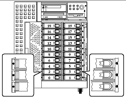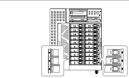 FIGURE 3-1 shows the system's 20 internal disk slots. Disk slots are numbered from 0 to 19. When adding a new disk drive to the system, you should install the drive in the lowest available slot number.