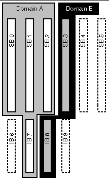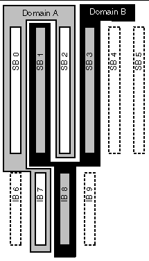 As an example reconfiguration of system resources, consider the following Sun Fire system configuration, as depicted in the diagram that follows: domain A contains system boards 0 and 2, and I/O board 7. Domain B contains system boards 1 and 3, and I/O board 8.