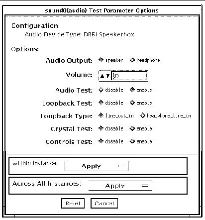 Note Note - Upon startup, the SunVTS probe utility determines which audio implementation is present and adjusts the audiotest Option menu appropriately. Your dialog box may look different than the one pictured here, but will contain some or all of these options.