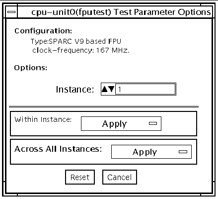 To reach the dialog box below, right-click on the test name in the System Map and select Test Parameter Options. If you do not see this test in the System Map, you might need to expand the collapsed groups, or your system may not include the device appropriate to this test. Refer to the SunVTS User's Guide for more details.
