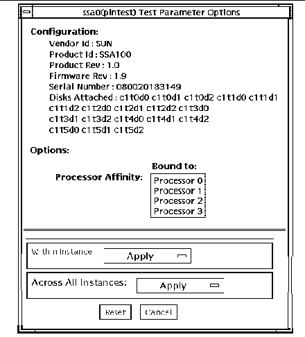To reach the dialog box below, right-click on the test name in the System Map and select Test Parameter Options. If you do not see this test in the System Map, you might need to expand the collapsed groups, or your system may not include the device appropriate to this test. Refer to the SunVTS User's Guide for more details.