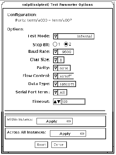 To reach the dialog box below, right-click on the test name in the System Map and select Test Parameter Options. If you do not see this test in the System Map, you might need to expand the collapsed groups, or your system may not include the device appropriate to this test. Refer to the SunVTS User's Guide for more details.