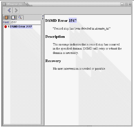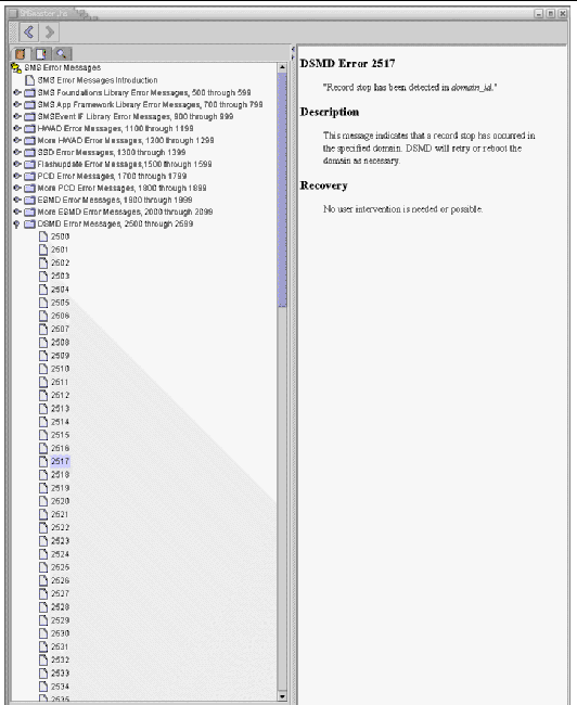 To scroll the Table of Contents, left click on the message folder containing your error message, in this case DSMD Error Messages, 2500 through 2599, then left click on error 2517 as shown in the following example.