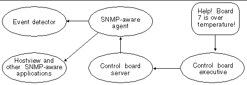 The SSP provides a set of interfaces for accessing the control board through the control board server and the simple network management protocol (SNMP) agent. edd (1M) uses the control board server interface to configure the event detection monitoring task on the control board executive ( FIGURE 10-2 ).