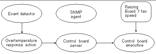 After it is configured, the event detection monitoring task polls various conditions within the platform, including environmental conditions, signature blocks, power supply voltages, performance data, and so forth. If an event detection script detects a change of state that warrants an event, an event message containing the pertinent information is generated and delivered to the control board server, cbs (1M). Upon receipt of the event message, the control board server delivers the event to the SNMP agent, which in turn generates an SNMP trap ( FIGURE 10-3 ).
