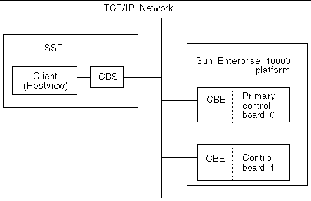 The Sun Enterprise 10000 system control board interface is accessed over an Ethernet connection using the TCP/IP protocol. The control board executive, CBE, runs on the control board. The control board server, cbs (1M), runs on the SSP and makes service requests. The SSP control board server provides services to SSP clients.