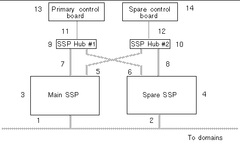 The following figure illustrates the standard layout of a dual SSP and control board configuration required for automatic failover. The numbers identify points of failure that are detected by the fod daemon, and are summarized in TABLE 10-2 .