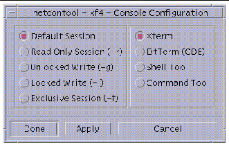 You can specify the netcon (1M) -g option for Unlocked Write permission, -l for Locked Write permission, -f to force Exclusive Session mode, or -r for read-only mode. See TABLE 4-2 for a description of these configuration options. Also refer to the netcon (1M) man page for an explanation of how netcon (1M) behaves if you do not specify any of these arguments.
