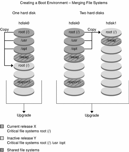Figure 30-3 shows critical file systems that have been merged and copied to slices on a disk to create a new boot environment. The active boot environment contains root (/), /usr, /var, and /opt each on their own slice. In the new boot environment, /usr and /opt are merged into root (/) on one slice. The file systems /swap and /export/home are shared by both boot environments.