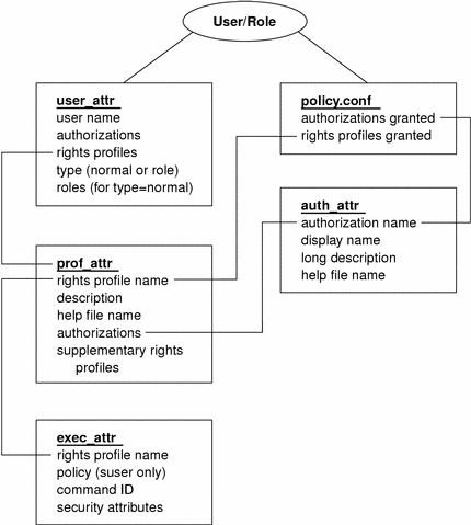 The user_attr database contains the attributes that are shown, including a comma-separated list of profile names. The contents of the profiles are split between the prof_attr file and the exec_attr file. The prof_attr file contains rights profile identification information, authorizations that are assigned to the rights profile, and rights profiles that are nested. The exec_attr file identifies the policy and contains commands with their associated security attributes. The auth_attr file supplies authorization information to the Solaris Management Console tools.